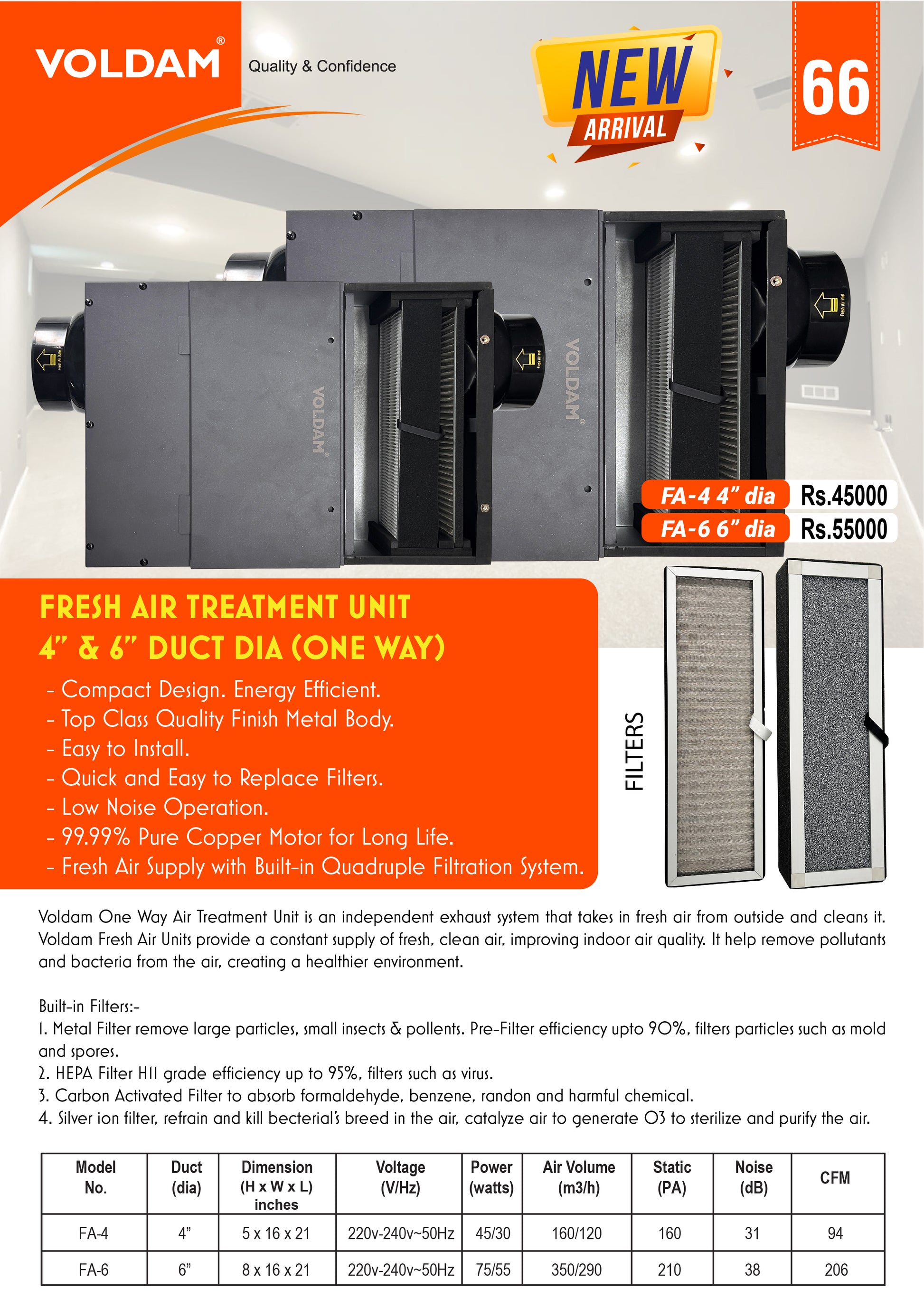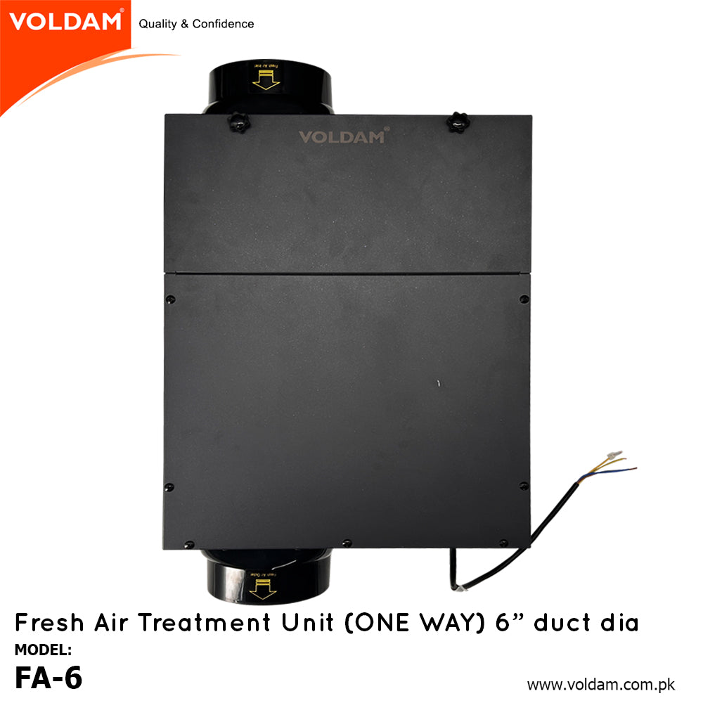 Voldam One Way Air Treatment Unit available in 4" and 6" duct dia. It is an independent exhaust system that takes in fresh air from outside and cleans it. Voldam Fresh Air Units provide a constant supply of fresh, clean air, improving indoor air quality. It help remove pollutants and bacteria from the air, creating a healthier environment.